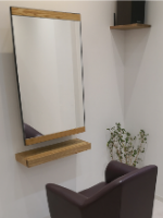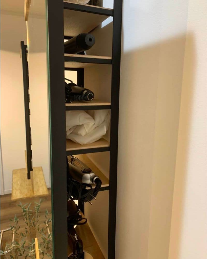 コンセントを左右に付けることでドライヤーなどの電化製品を使用可能にし上には収納も確保しました。